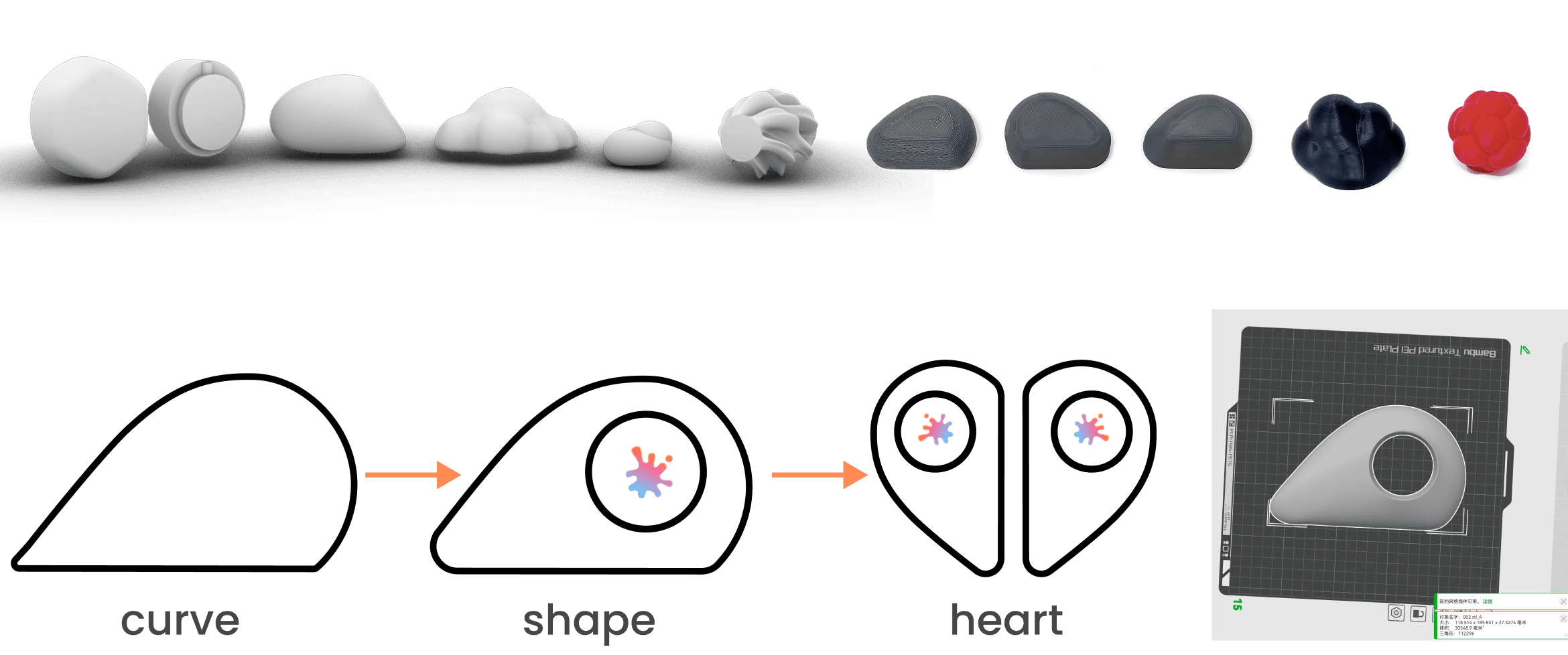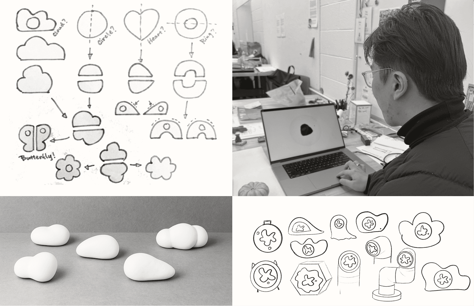 Early studies referenced natural forms such as stones and clouds, focusing on soft, familiar qualities that evoke care, warmth, and closeness.